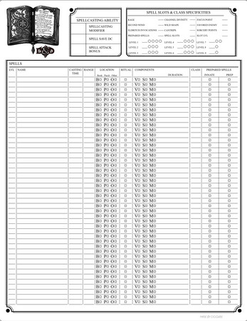 A complete, fillable character sheet and spellbook, beautifully designed for your favorite fantasy tabletop roleplaying games.