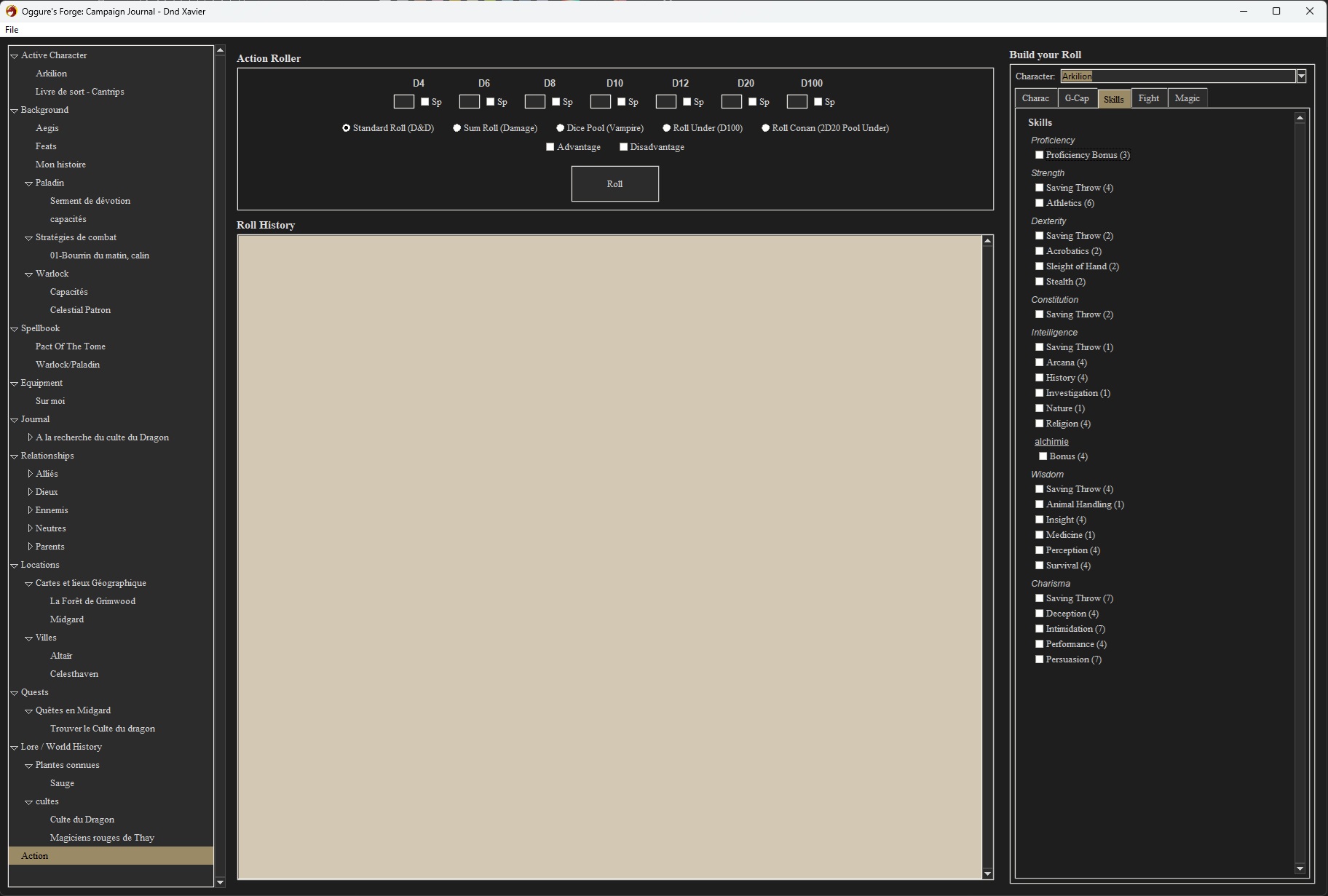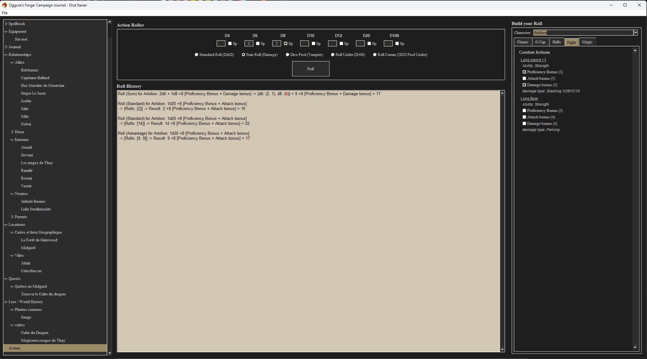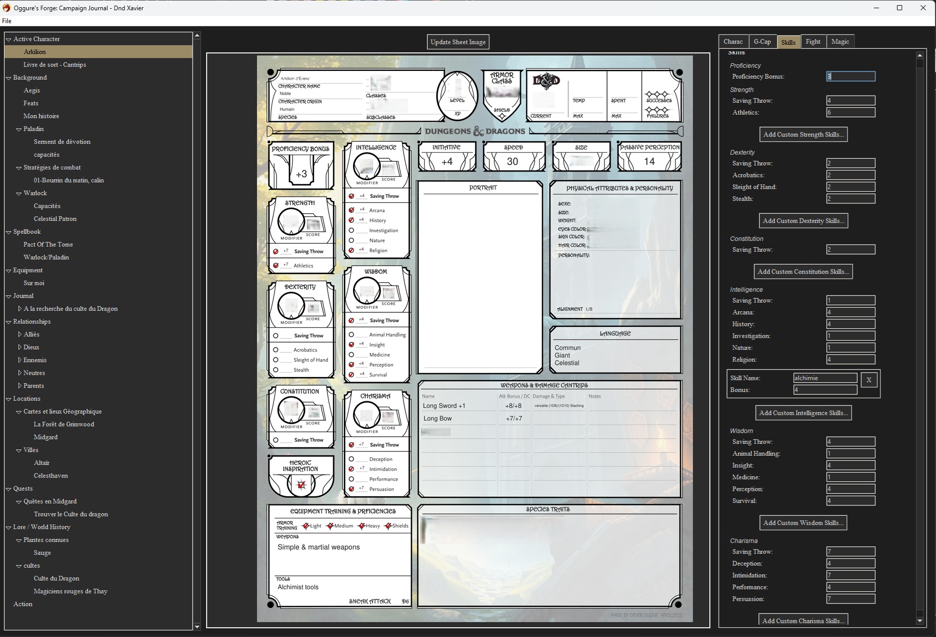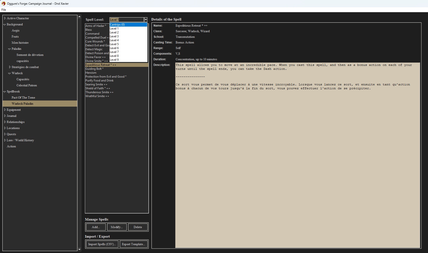 - Spellbook: A dedicated interface for managing spell lists, complete with filtering by level and detailed descriptions.