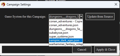 - Pre-built "cartridges" to get you started, including a versatile D&D-like system and a complete implementation for Conan: Adventures in an Age Undreamed Of (2d20 System). But also, Vampire and a special Subabysse french RPG